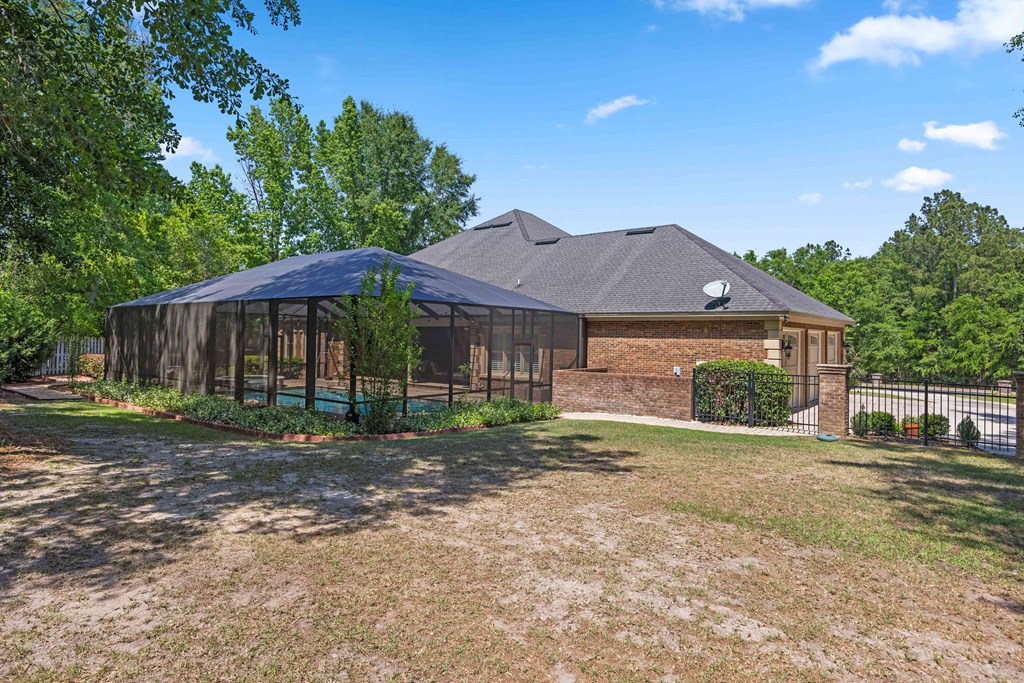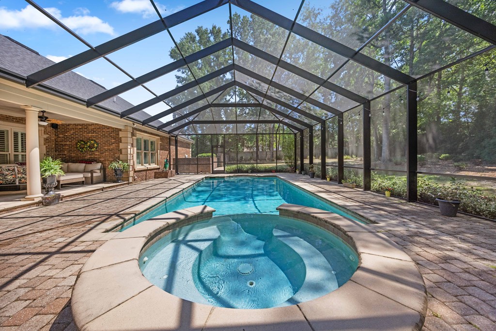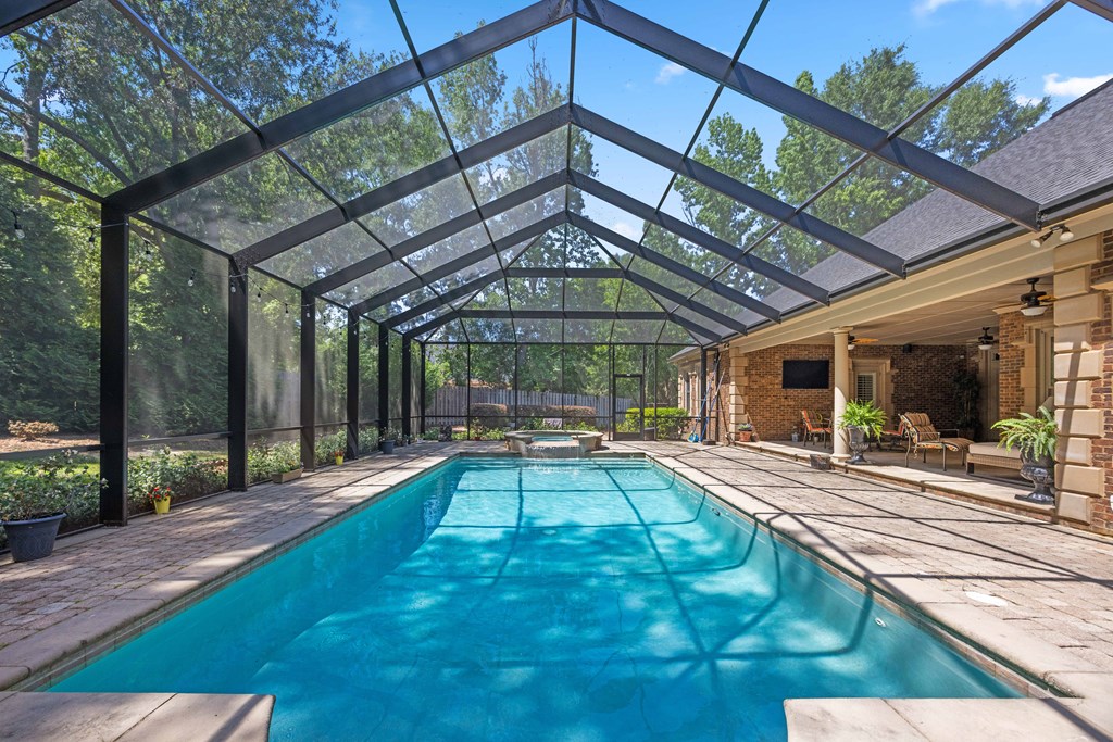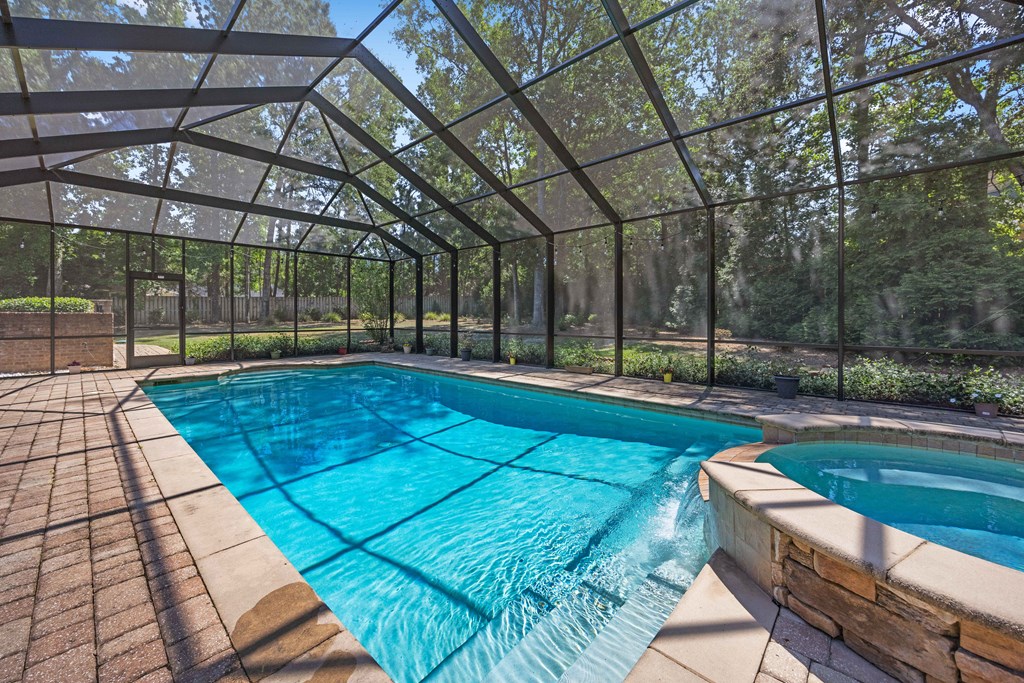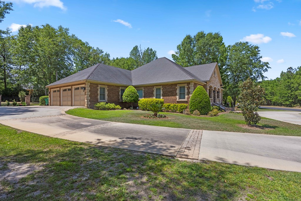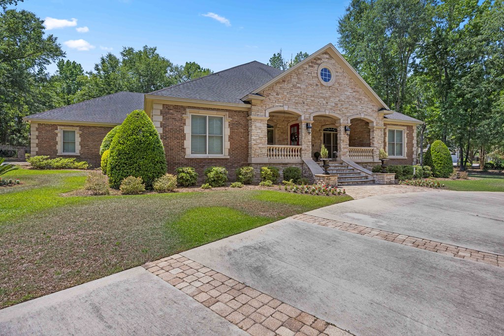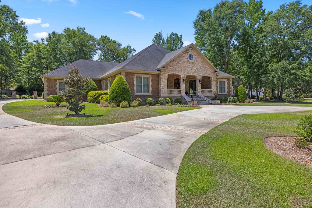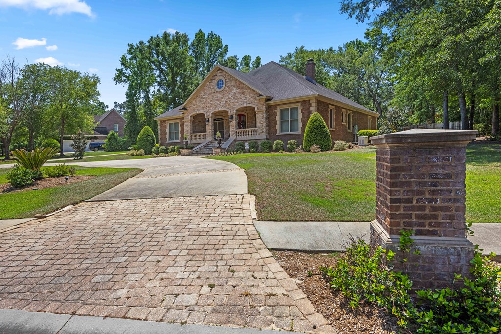 Discover a rare opportunity to own a truly exceptional all-brick home in Kinderlou Forest, South Georgia's premier golf and lifestyle community. Showcasing masterful masonry and architectural detail that is increasingly hard to find, this residence offers a level of craftsmanship and character that sets it apart. From the moment you arrive, you're welcomed by a grand circular drive, a spacious, beautifully landscaped lot with mature plantings, and a stately brick fence that enhances both curb appeal and privacy. A generous three-car garage and meticulously maintained exterior reflect the pride of ownership evident throughout the property. Inside, rich hardwood floors, elegant finishes, and thoughtfully curated pops of color create a warm yet sophisticated atmosphere. The home's layout offers both comfort and functionality, ideal for everyday living and entertaining alike. Step into the backyard and experience a true private retreat - an inviting patio space that feels like an escape from the everyday. Whether hosting guests or enjoying a quiet afternoon, the setting is serene and shaded. The saltwater pool and hot tub, complemented by a newly installed pool enclosure, provide the perfect centerpiece, surrounded by fragrant seasonal and perennial gardens. Kinderlou Forest is a 24-gated community that features championship private golf, dining, pickleball and tennis courts, two work out facilities, lake and river access, walking trails, and much more!