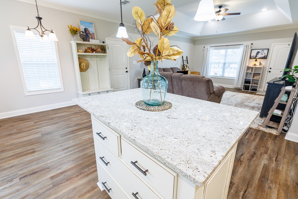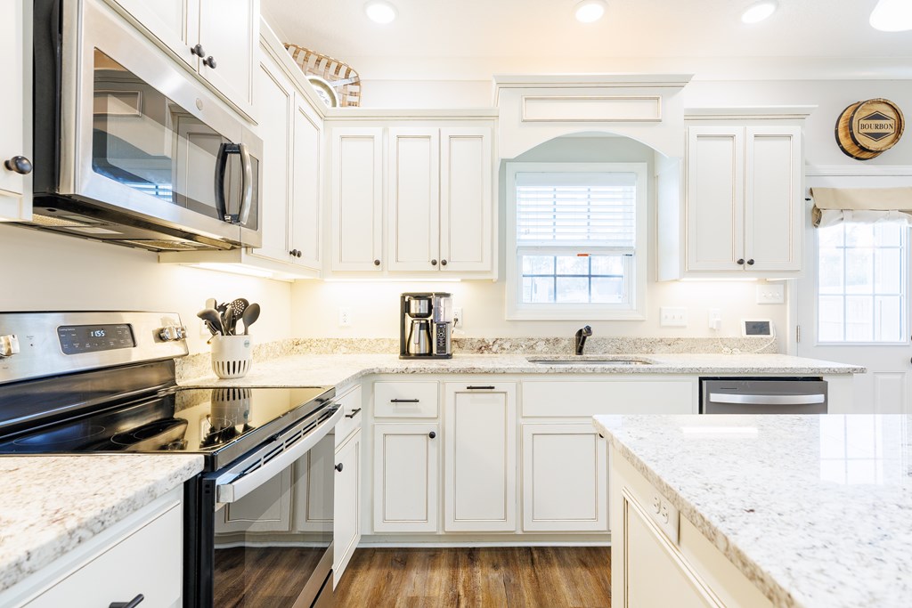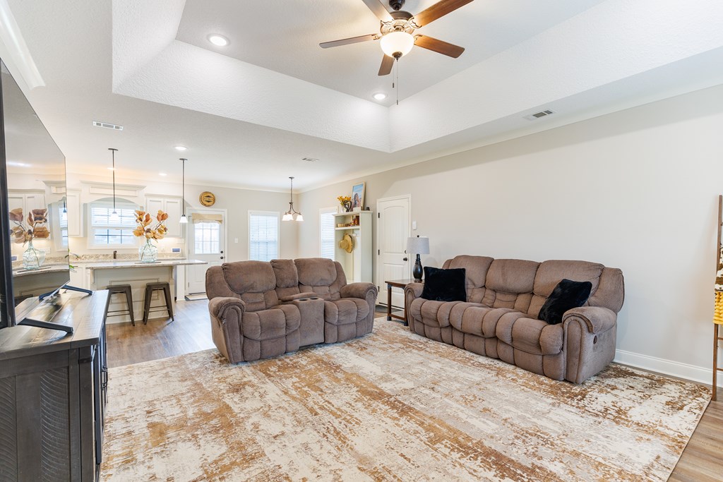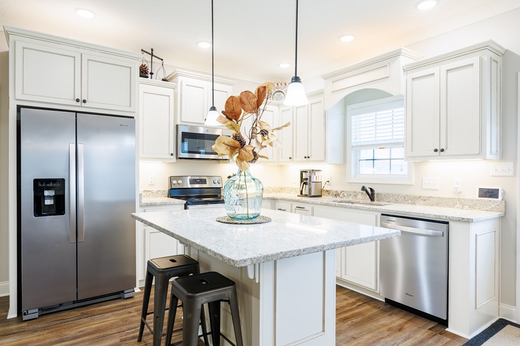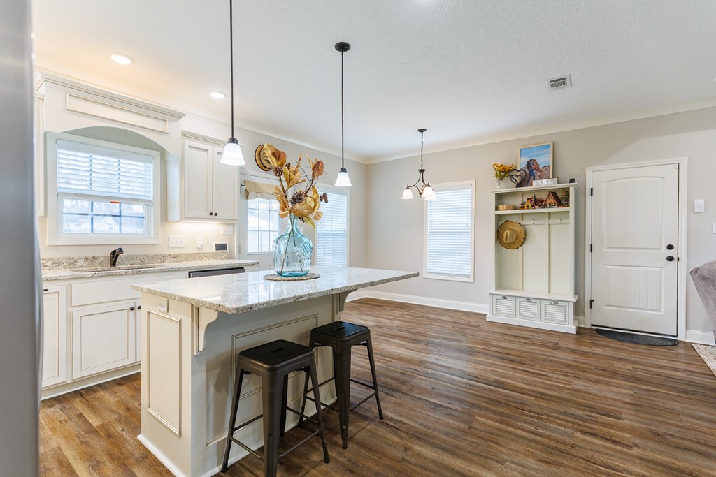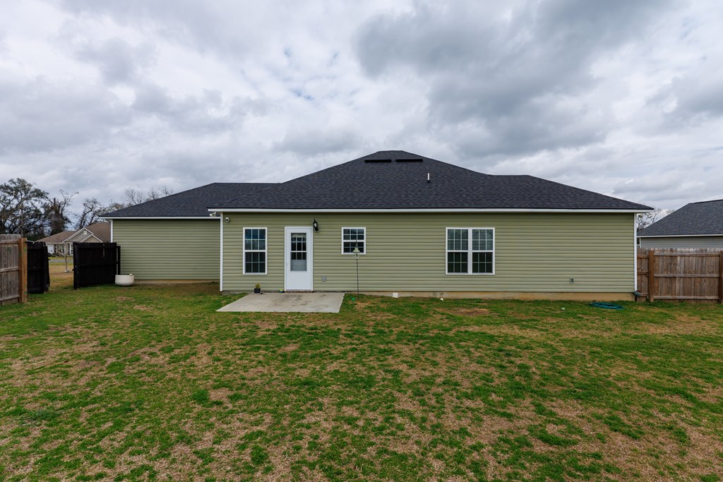 Welcome home to North Moody Subdivision! Situated on over half an acre, this beautiful 4 bedroom, 2 bathroom home offers the perfect blend of space, style, and convenience, just a short 10-minute drive to Moody Air Force Base. From the moment you arrive, you'll love the charming curb appeal featuring vinyl siding, a full gutter system, a two-car garage, and a covered front porch accented with wood columns and classic shutters. Step inside to an inviting open floorplan that immediately welcomes you with abundant natural light, recessed lighting, a tray ceiling, and durable LVP flooring flowing throughout the main living areas. The spacious living room opens seamlessly into the dining area and kitchen, creating an ideal layout for entertaining and everyday living. The kitchen is a standout with beautiful granite countertops, under-cabinet lighting, stainless steel appliances, stylish cabinetry, and a large island perfect for barstool seating and gathering with family and friends. Tucked privately at the back of the home, the primary suite is filled with natural light and features a charming barn-style door leading into the spa-like primary bathroom complete with dual sinks, a walk-in closet, separate shower, and a beautifully tiled soaking tub bathed in natural light. On the front side of the home, you'll find three generously sized guest bedrooms and a well-appointed secondary bathroom, offering flexibility for family, guests, or a home office. Step outside to enjoy the fully fenced .53-acre lot, an ideal space to relax, entertain, or simply enjoy the extra room to spread out. This North Moody gem truly combines comfort, functionality, and location all in one. This home is USDA eligible and has a termite bond!