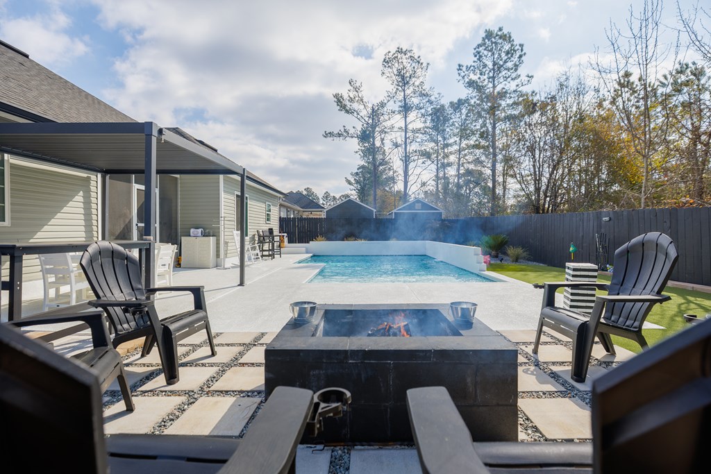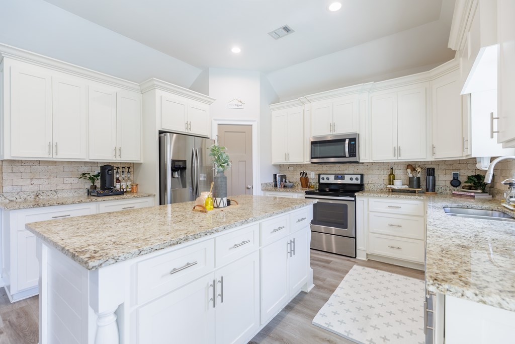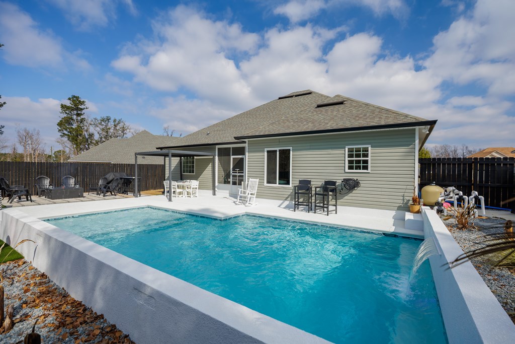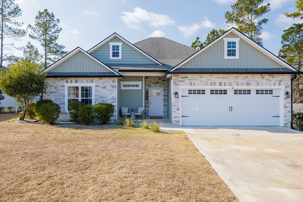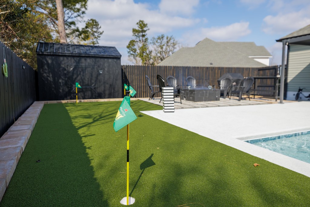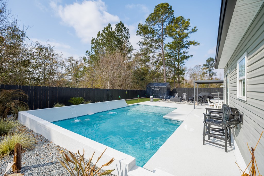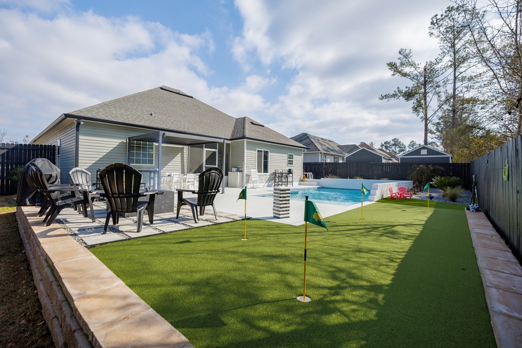 Welcome to Gramercy Subdivision, no HOA and just 7 minutes to Moody AFB. This stunning 4-bed, 2-bath home offers standout upgrades inside and out, including a custom-built backyard oasis designed for entertaining. Curb appeal shines with upgraded rock landscaping, a full home gutter system, a two-car garage with EV charger, and a whole-house water filtration system with reverse osmosis drinking fountain in the kitchen. Inside, the foyer features elegant wainscoting and high ceilings that open into a bright, open-concept living space with 11' tray ceilings flowing into the dining area with a large picture window providing abundant natural light. The kitchen is both stylish and functional with granite countertops, tiled backsplash, stainless steel appliances, a large corner pantry, and an oversized island with shiplap detailing. The split floor plan places three guest bedrooms on one side of the home, along with a guest bath offering dual sinks and designer tile, while the private primary suite is situated on the opposite side and includes tray ceilings, a walk-in closet, and sliding barn door leading to the bathroom with granite countertops, dual sinks, tiled shower, shiplap-accented soaking tub, and two additional walk-in closets. Step outside through the 12'x10.5' screened-in patio into your personal retreat featuring a custom saltwater cocktail pool with cool decking on all concrete surfaces, three waterfalls, two bubblers, sun shelf, underwater barstools, built-in umbrella holder, tabletop drink ledge, and multi-color LED lighting controlled from the dining room. Golf enthusiasts will appreciate the 4-hole putting green paired with an extended turf chipping area. Additional outdoor highlights include a 10'x10' metal pergola, concrete fire pit with pavers, grilling area, lush banana tree landscaping, a 12'x8' shed with power, lighting, and metal roof, and an 8-foot wood privacy fence with side gate. This home blends comfort, functionality, and resort-style living.