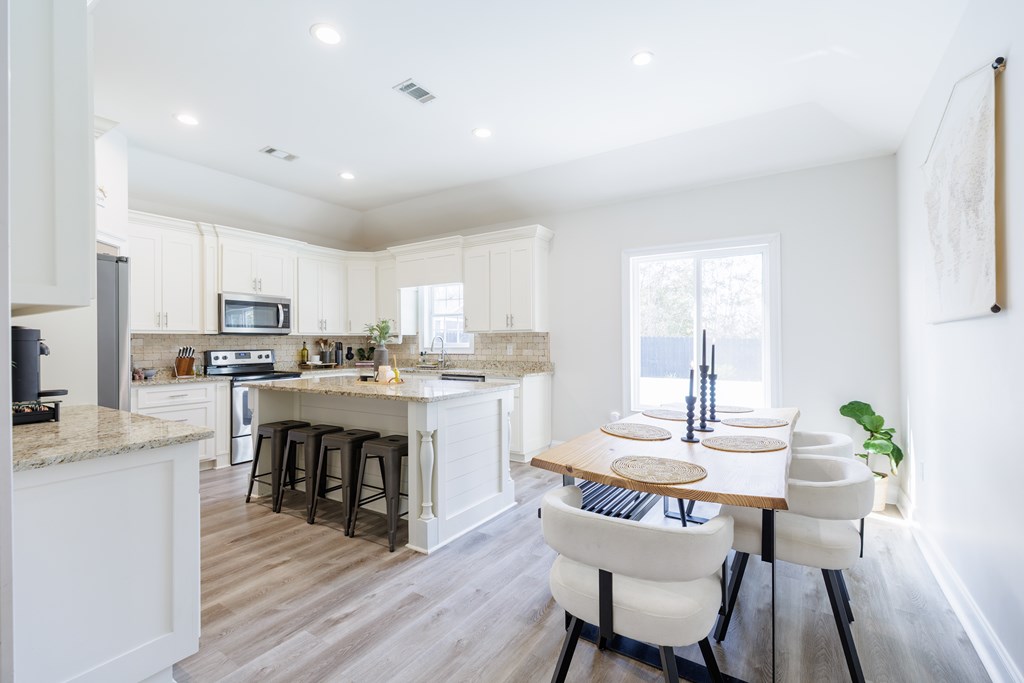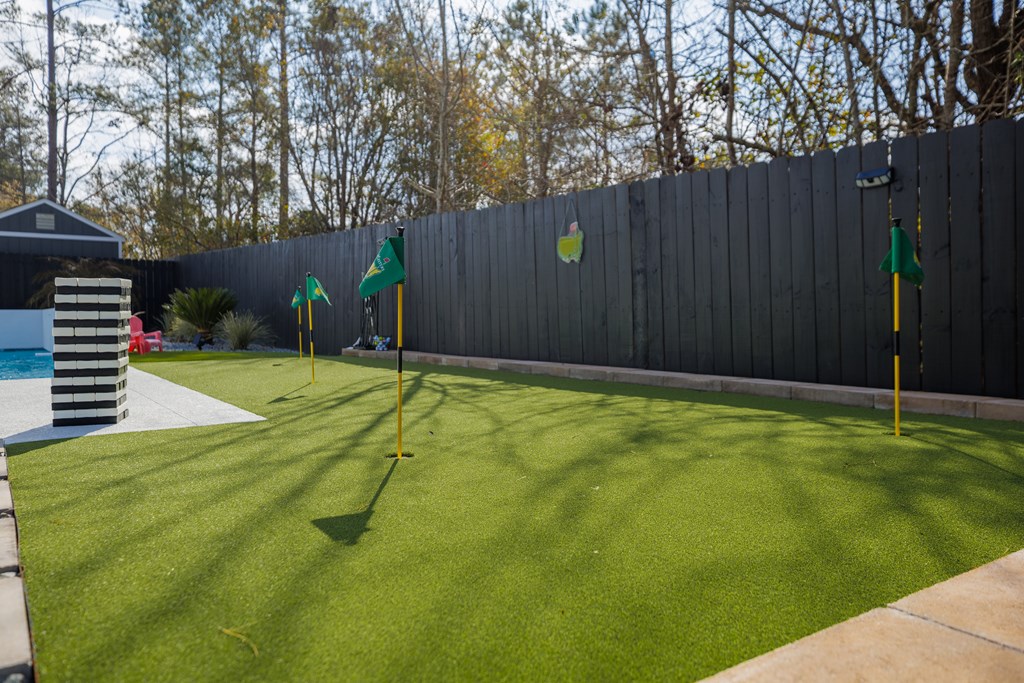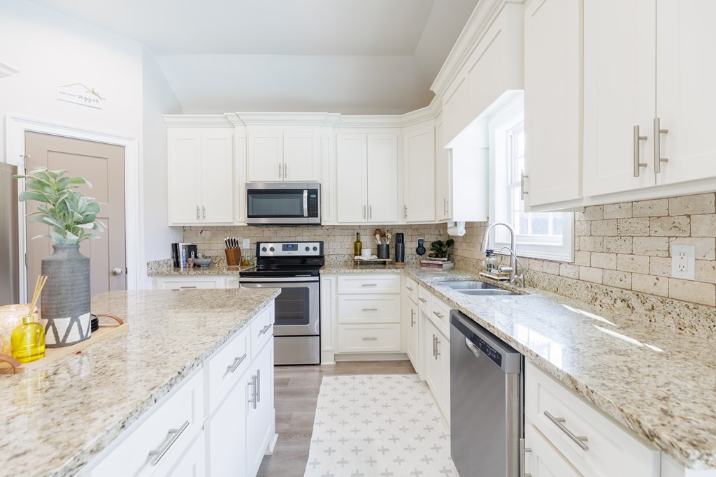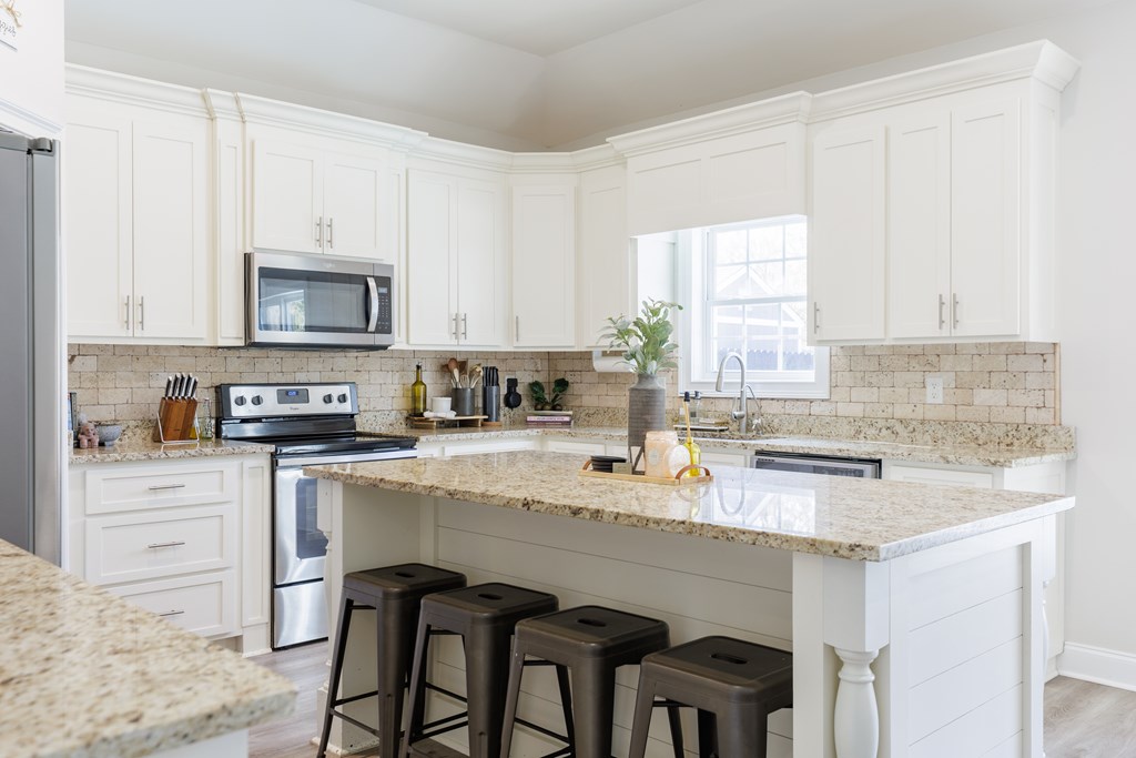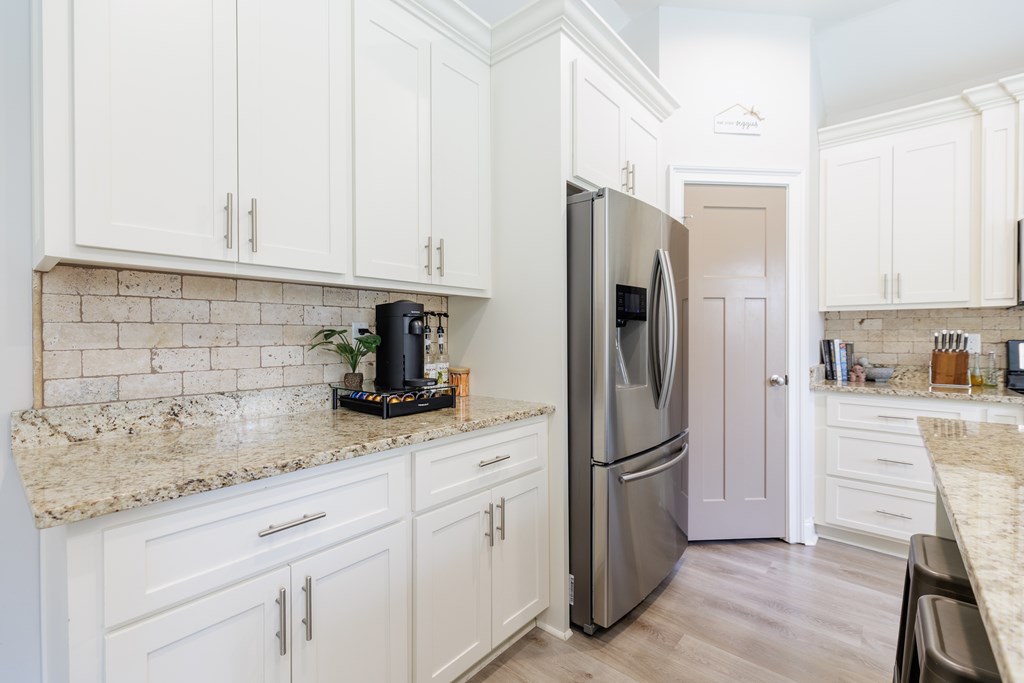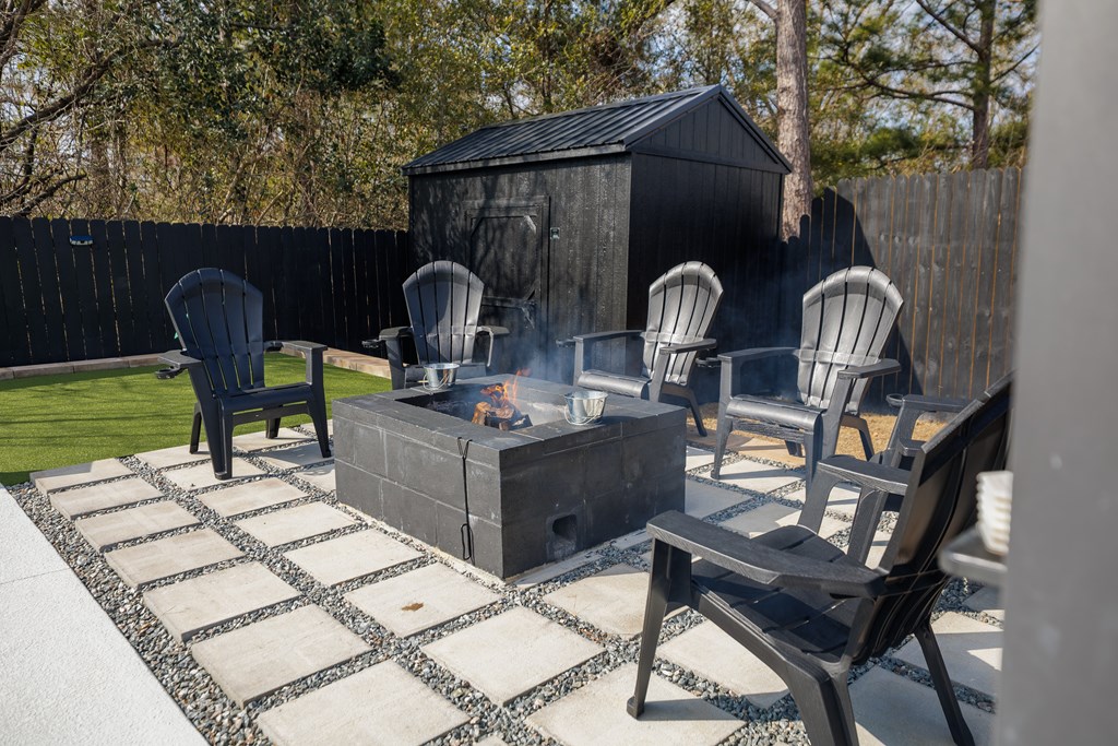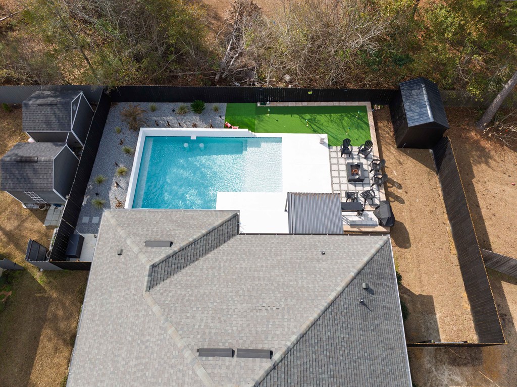 Welcome to Gramercy Subdivision, no HOA and just 7 minutes to Moody AFB. This stunning 4-bed, 2-bath home offers standout upgrades inside and out, including a custom-built backyard oasis designed for entertaining. Curb appeal shines with upgraded rock landscaping, a full home gutter system, a two-car garage with EV charger, and a whole-house water filtration system with reverse osmosis drinking fountain in the kitchen. Inside, the foyer features elegant wainscoting and high ceilings that open into a bright, open-concept living space with 11' tray ceilings flowing into the dining area with a large picture window providing abundant natural light. The kitchen is both stylish and functional with granite countertops, tiled backsplash, stainless steel appliances, a large corner pantry, and an oversized island with shiplap detailing. The split floor plan places three guest bedrooms on one side of the home, along with a guest bath offering dual sinks and designer tile, while the private primary suite is situated on the opposite side and includes tray ceilings, a walk-in closet, and sliding barn door leading to the bathroom with granite countertops, dual sinks, tiled shower, shiplap-accented soaking tub, and two additional walk-in closets. Step outside through the 12'x10.5' screened-in patio into your personal retreat featuring a custom saltwater cocktail pool with cool decking on all concrete surfaces, three waterfalls, two bubblers, sun shelf, underwater barstools, built-in umbrella holder, tabletop drink ledge, and multi-color LED lighting controlled from the dining room. Golf enthusiasts will appreciate the 4-hole putting green paired with an extended turf chipping area. Additional outdoor highlights include a 10'x10' metal pergola, concrete fire pit with pavers, grilling area, lush banana tree landscaping, a 12'x8' shed with power, lighting, and metal roof, and an 8-foot wood privacy fence with side gate. This home blends comfort, functionality, and resort-style living.